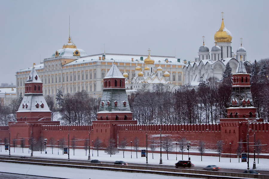 Red Square, the Kremlin and St Basil's Cathedral as snow finally arrives in Moscow's warmest winter since records began.