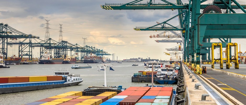 Loaded ships in busy port of Antwerp at container terminal with automated cranes and lots of vessels. Belgium