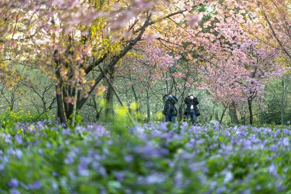 Tourists take photos of cherry blossoms at Moshan scenic spot in Wuhan, central China's Hubei Province, March 14, 2020. As weather warms up, cherry blossoms here are in full bloom. (Xinhua/Xiong Qi)