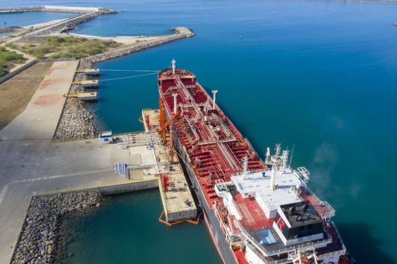 Aerial photo taken on April 6, 2020 shows the Marshall Islands-based Mt. Melody bunkering ship in operation at Hambantota International Port, Sri Lanka. (Photo by Liu Hongru/Xinhua)