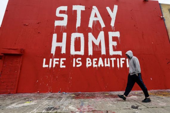 A man walks past an epidemic themed mural in downtown Los Angeles, the United States, April 10, 2020. (Xinhua)