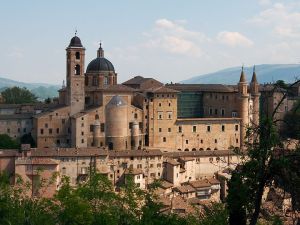 The original capital of the Duchy of Montefeltro (35 km from Pesaro) extends across the top of two hills. Its houses and churches are built down each hill as far Porta